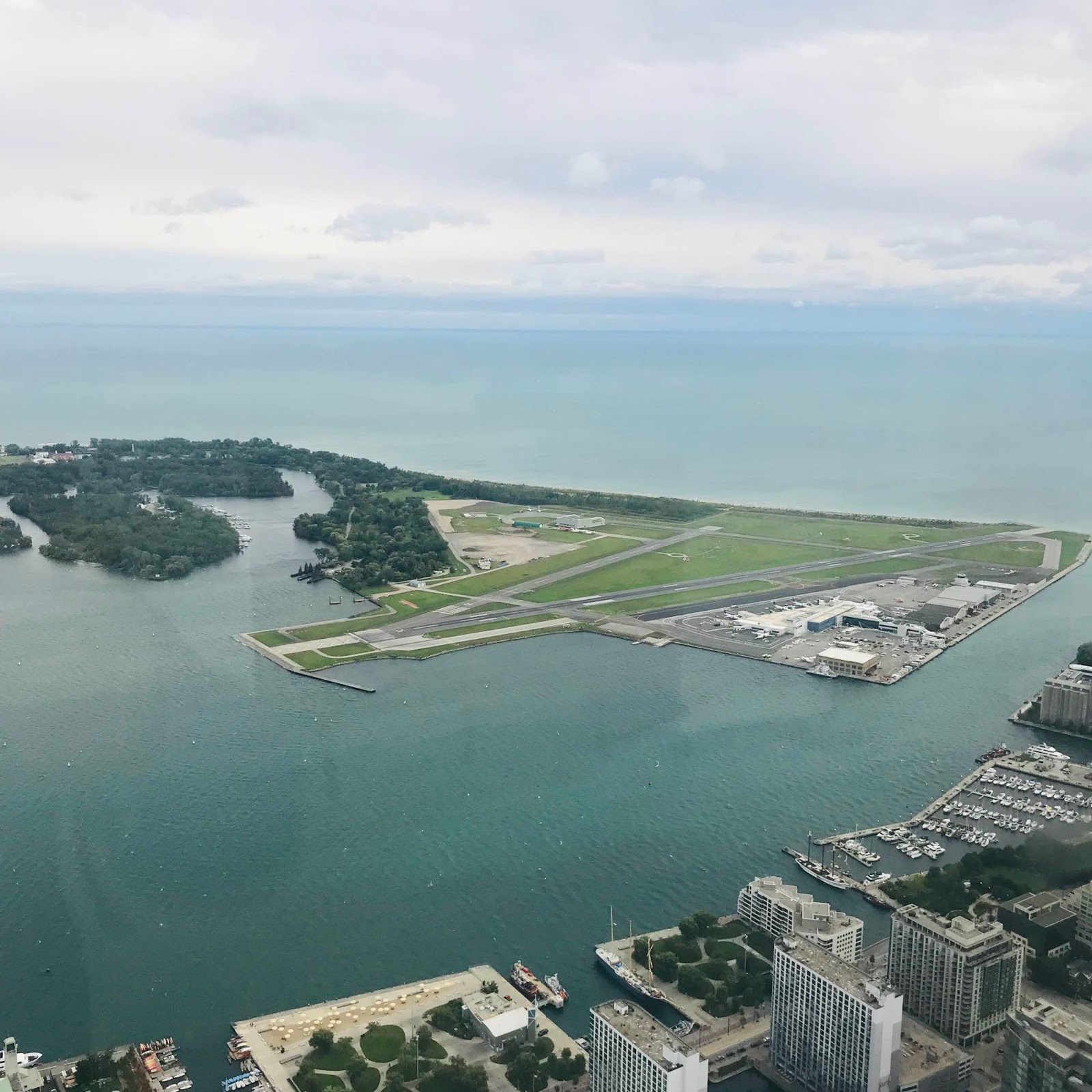 東京スカイツリーの場合、ツリーの南側や西側は見ていて楽しいのですが、東側や北側には見どころが乏しいので今ひとつですよね。その点、CNタワーは360度楽しめます。海のある南側に、島と空港があるところがポイントです。